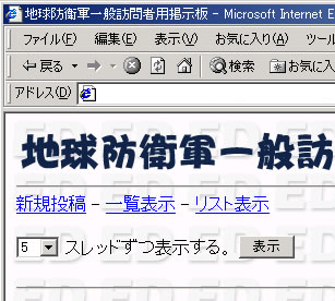 掲示板にアクセスするには。まずトップページの「掲示板」ボタンを押します。これによって、「地球防衛軍掲示板」トップページとなります。