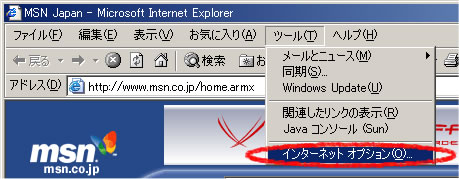 - メニューバーの「ツール」から「インターネット オプション」を選択します。