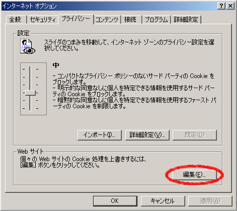 - 「設定」が「中」となっていることを確認して、「Web サイト」の「編集」ボタンを押します。「中」以外の設定になっている場合は、「既定」ボタンを押してください。「中」になります。