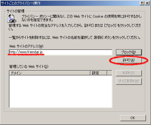 - 「Web サイトのアドレス」欄に「http://www.friend.gr.jp」と入力し「許可」ボタンを押します。