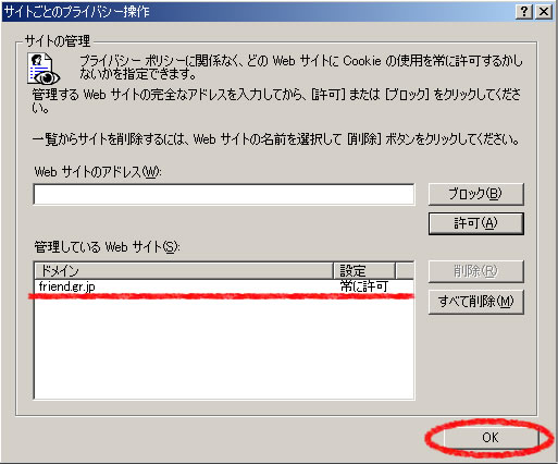 - 「管理している Web サイト」欄に「friend.gr.jp」、さらに「常に許可」となっていることを確認して「OK」ボタンを押してください。