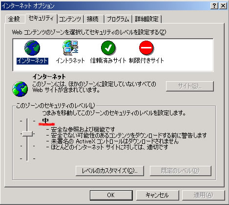 - 「このゾーンのセキュリティのレベル」が「中」になっていることを確認してください(デフォルト設定です)。これ以外に設定されている場合は「既定のレベル」ボタンを押してください。「中」に設定されます。