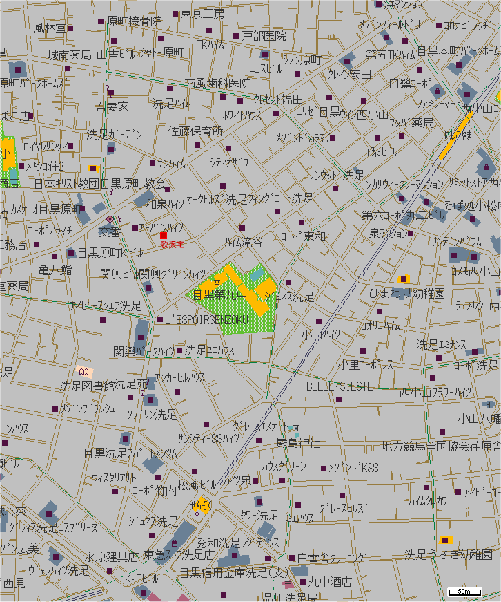 歌沢君の家の地図です。地図の上方向が北(右上方向が目黒、左下方向が田園調布)です。